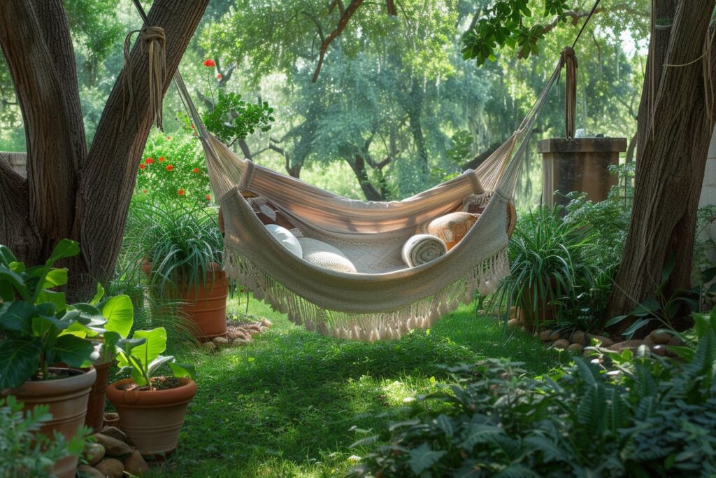 L’aménagement d’un espace confortable autour de votre filet suspendu maison permettra d’en profiter pleinement. Voici quelques idées pour créer un véritable cocon suspendu :
