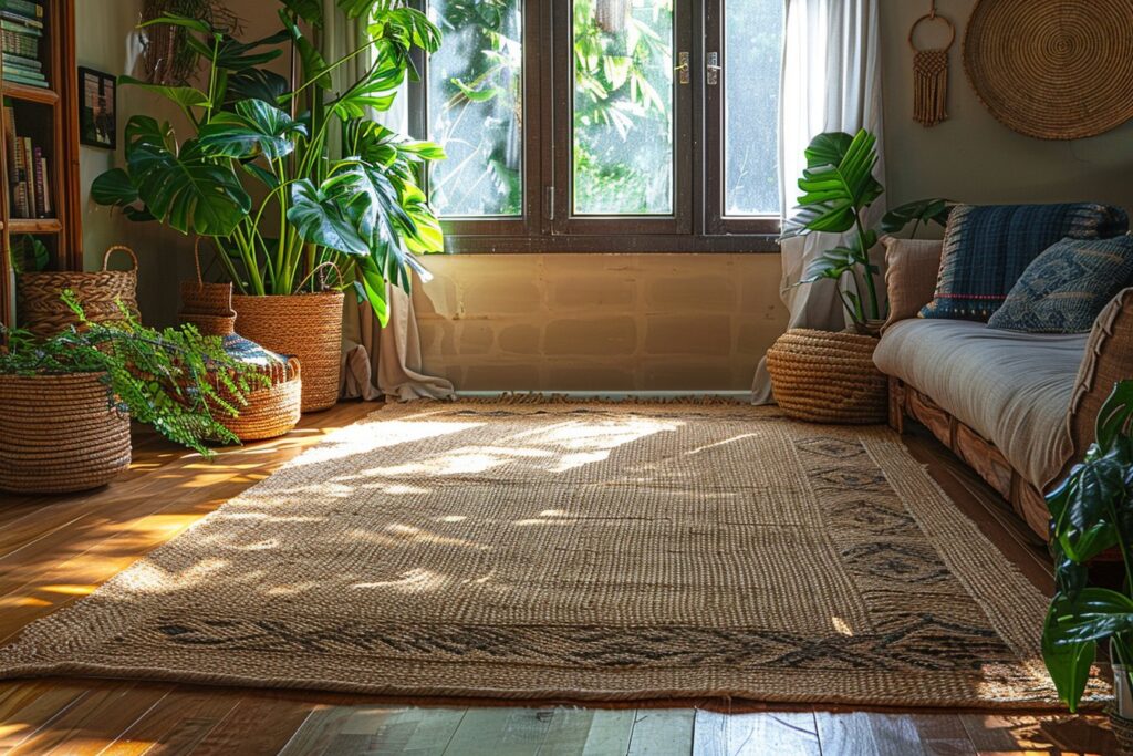 Dans un intérieur bohème chic, le tapis en jute joue un rôle central. Associez-le avec des textiles colorés, des coussins brodés et des meubles en bois ou en rotin. Placez-le sous une table basse vintage, entourée de plantes vertes pour créer une atmosphère chaleureuse et relaxante.