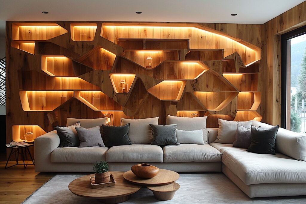 Au cœur du foyer, le salon est idéal pour introduire les tasseaux de bois et amener une ambiance chaleureuse. Une idée tendance consiste à poser des tasseaux horizontalement derrière la télévision, créant ainsi un point focal intéressant. Pour augmenter la texture, envisagez des tasseaux de différentes épaisseurs ou couleurs alternées. Cette stratégie ne se limite pas à l’esthétique ; elle offre aussi une solution pratique pour masquer les câbles des appareils multimédia.