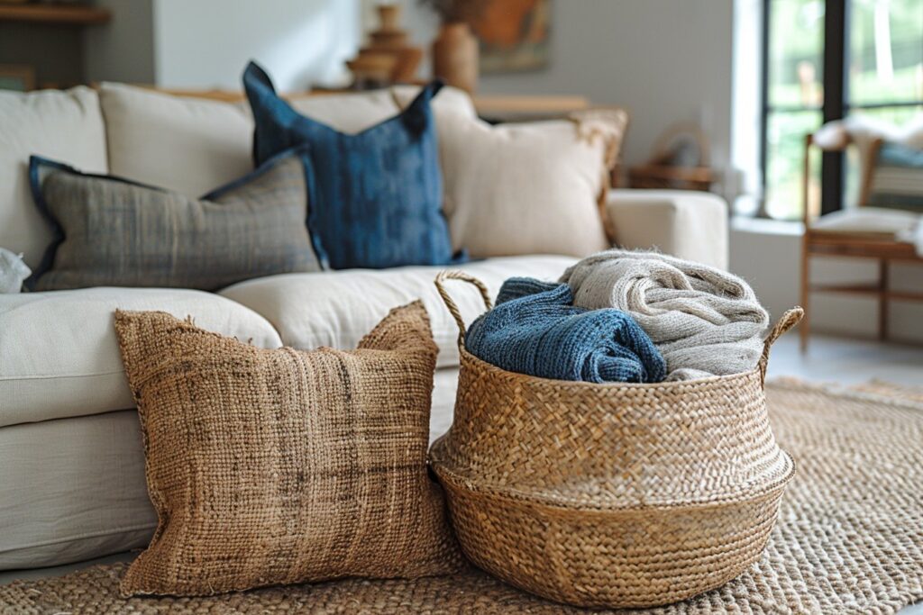 - Des coussins en jute : parfaits pour ajouter une note confortable mais élégante à votre canapé.